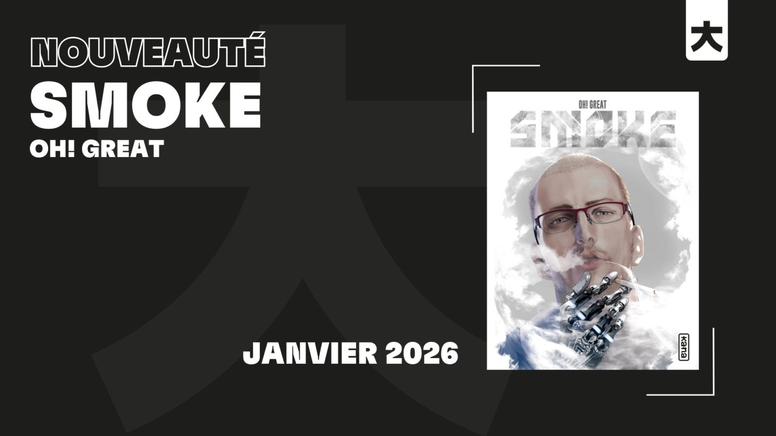 Le 30 janvier 2026, découvrez SMOKE, une bande dessinée couleur de 72 pages signée par le légendaire Oh! great. Dans un futur dominé par les intelligences artificielles, où émotions et spontanéité sont bannies, un livreur nommé Smoke et un robot-navigateur brisé par le système défient l’ordre établi.