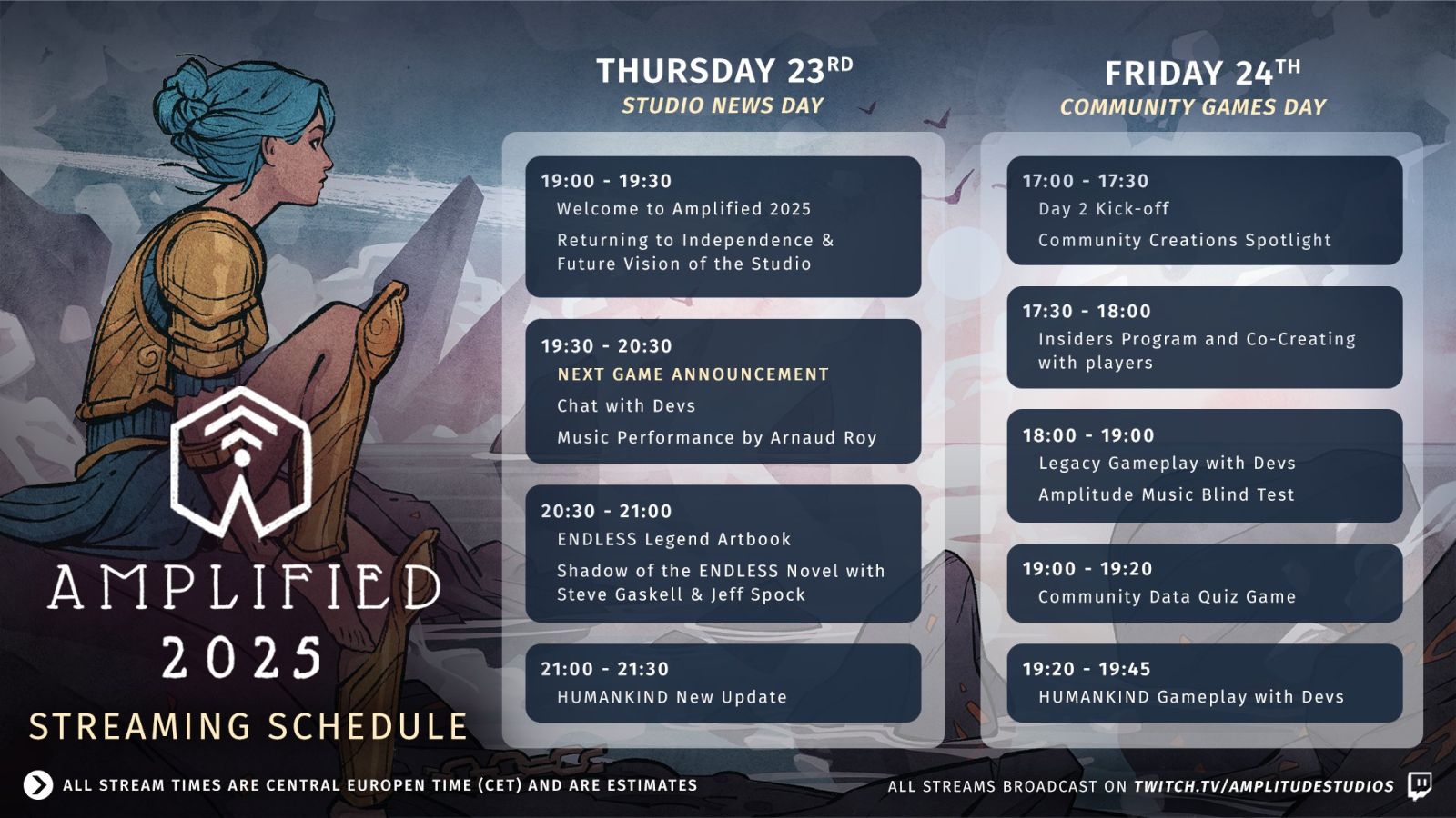 • Jeudi 23 septembre de 19h à 21h30 : Introduction du show et retour sur la prise d’indépendance du studio, en revenant notamment sur la vision de ce dernier. Après l’annonce d’un nouveau jeu, l’équipe de développement prendra la parole puis une performance musicale en live assurée par Arnaud Roy, compositeur des bandes originales de Humankind, Endless Space 2, Endless Legend et Dungeon of the Endless notamment.