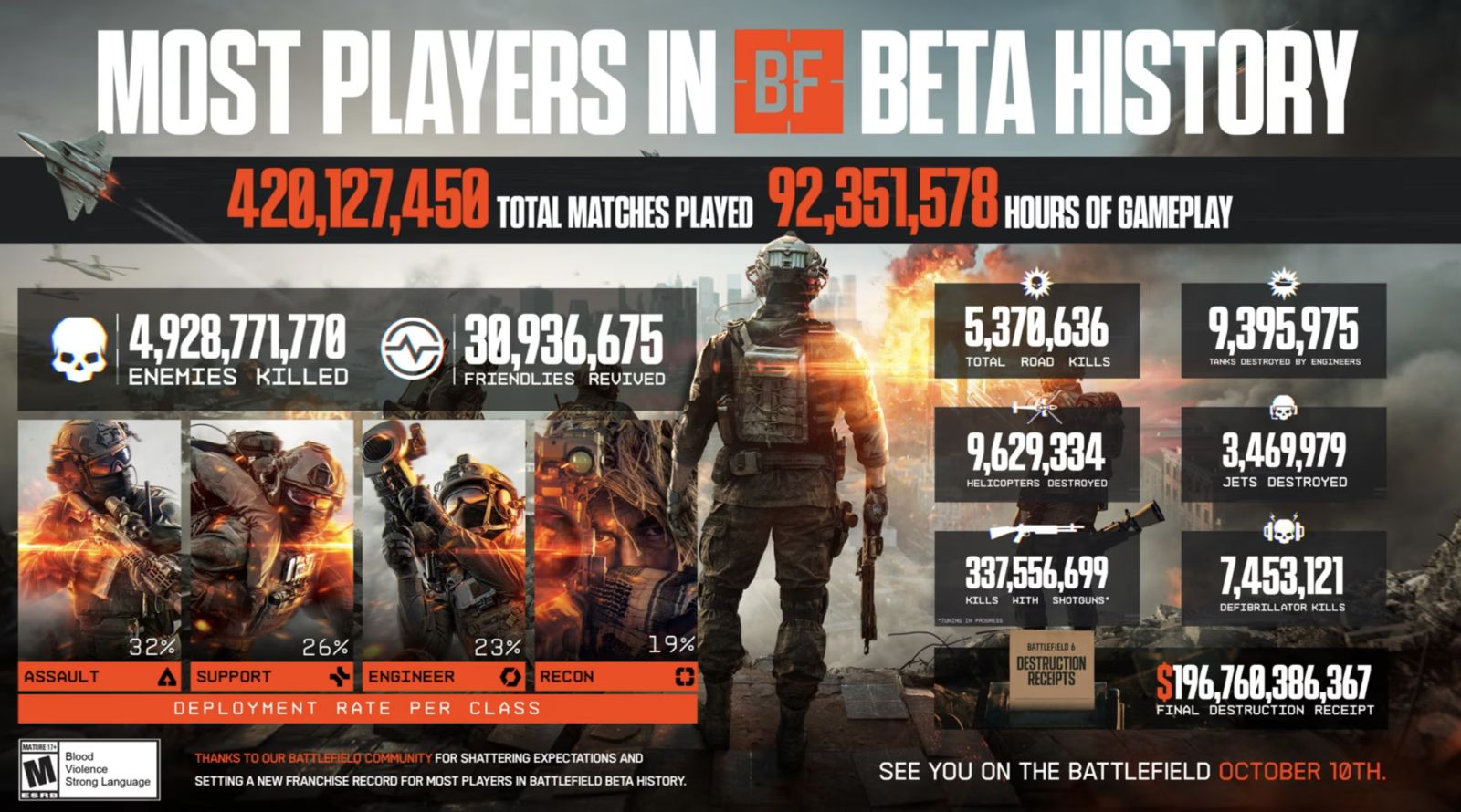 Le titre a atteint le plus grand nombre de joueur·euse·s jamais enregistré pour une bêta dans l’histoire de la franchise. Une infographie détaillée a été partagée à cette occasion, présentant une multitude de statistiques issues de la bêta, notamment le nombre total de matchs joués et d’heures de jeu, le nombre d’hélicoptères détruits, les éliminations avec défibrillateur ou encore les taux de déploiement par classe.
