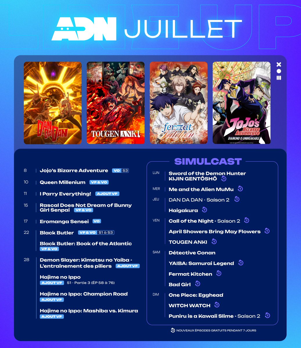 Bienvenue dans votre programmation estivale avec ADN ! Cette saison de simulcast s’annonce particulièrement riche avec le retour des nouvelles saisons très attendues de DAN DA DAN et Call of the Night. En plus de certains anime du printemps qui se poursuivent, de nouveaux succès débarquent avec notamment TOUGEN ANKI ! Et si vous souhaitez déguster un bon repas après une journée éprouvante, la cuisine mathématique de Fermat Kitchen vous attend !
