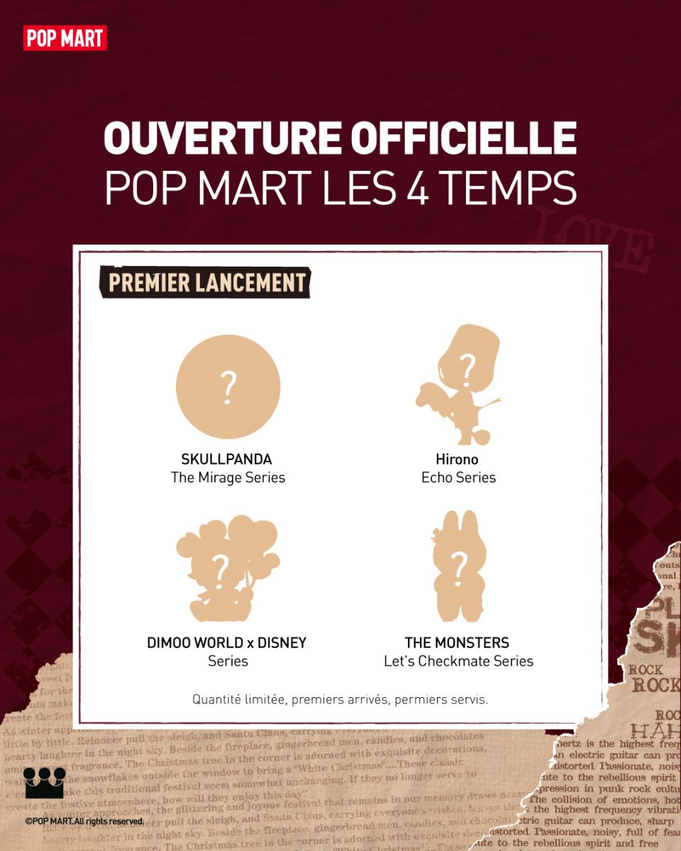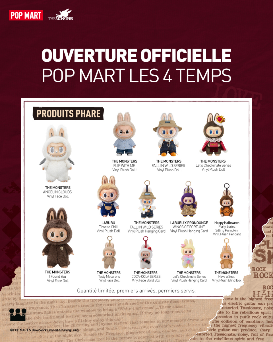 Voici la sélection de produits exclusifs, de produits phares et plein d'autres surprises lors de l'ouverture officielle de la boutique POP MART Les 4 Temps