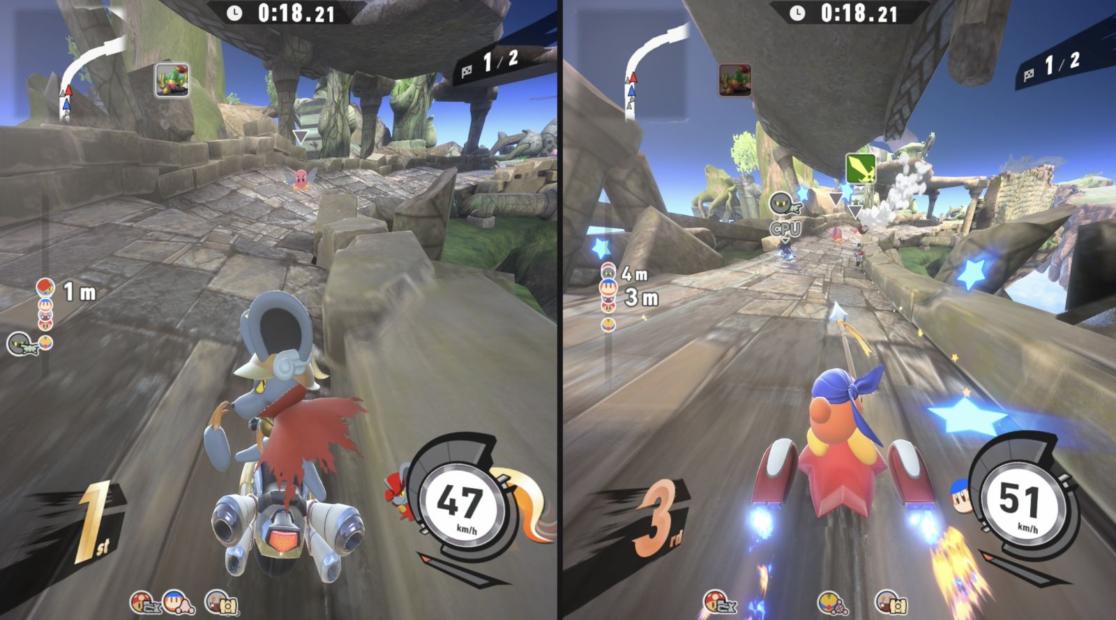 Le mode histoire est la grande nouveauté : 11 chapitres composés de courses, défis et mini-boss, avec plusieurs embranchements et fins alternatives. Les modes classiques font leur retour, notamment City Trial, Air Ride et Top Down Racing, toujours aussi chaotiques et amusants. En ligne, le jeu brille avec des courses fluides et compétitives.