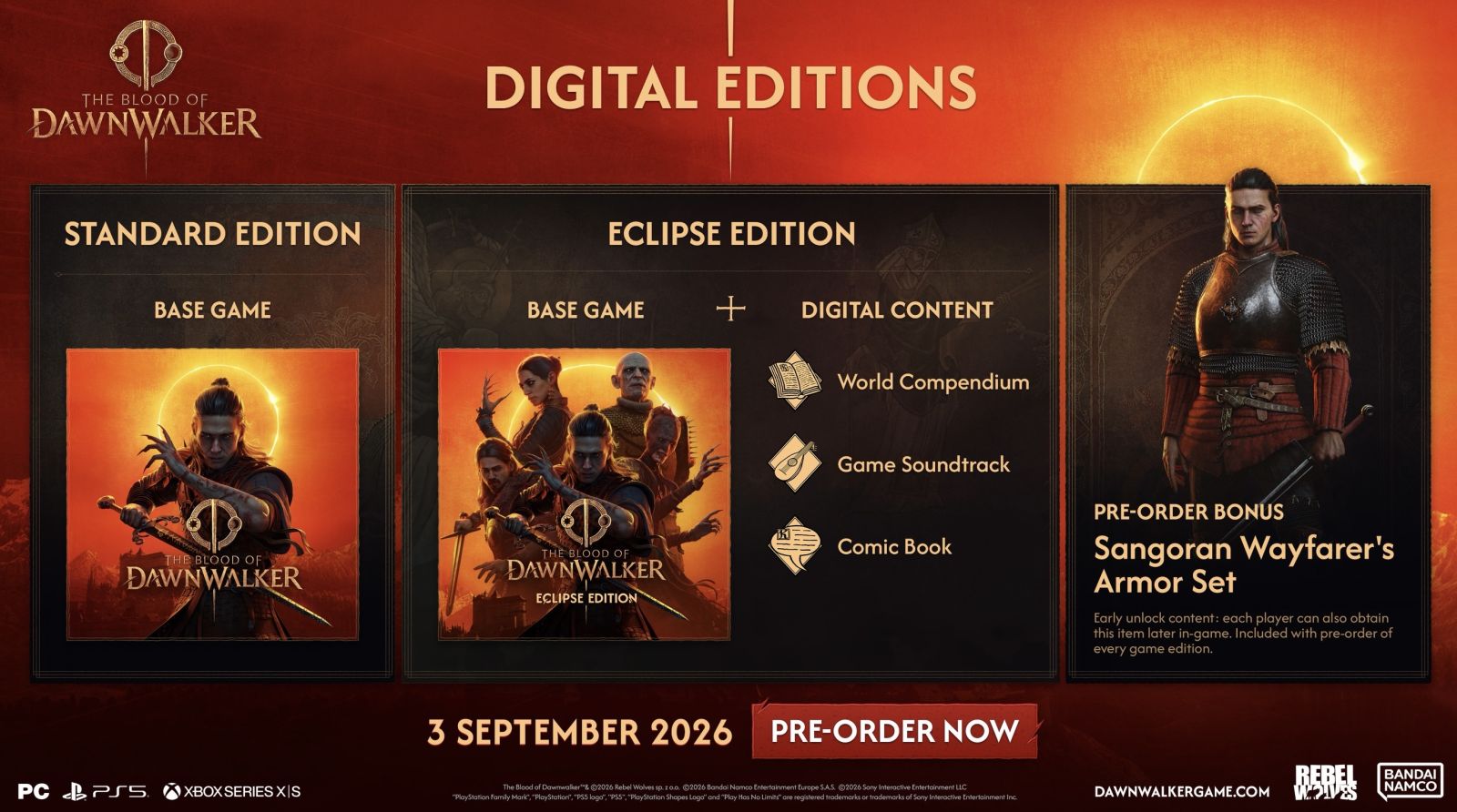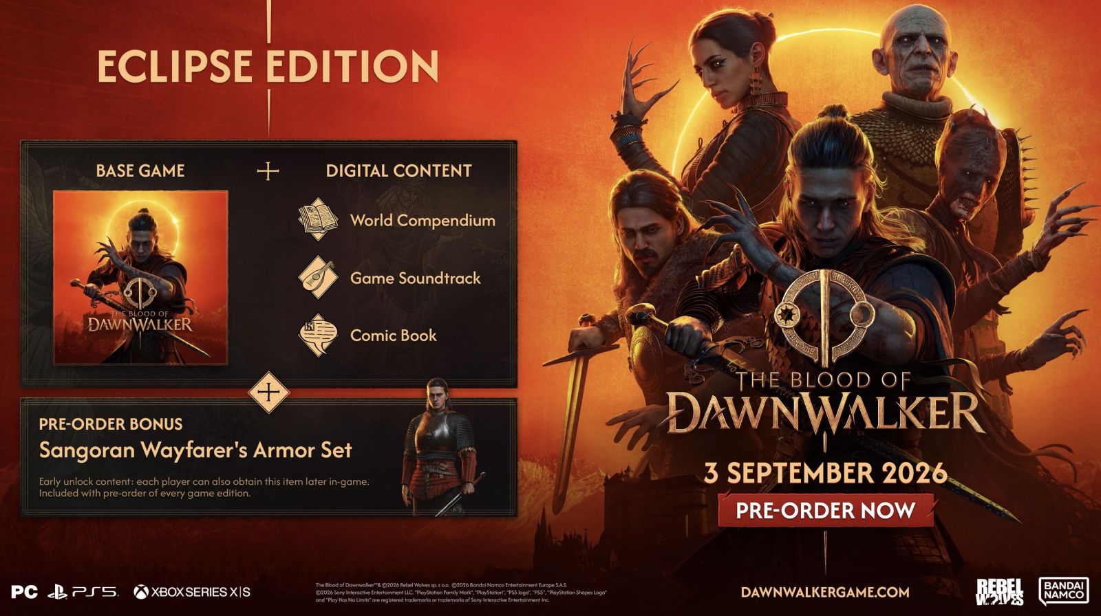 The Blood of Dawnwalker, premier jeu de Rebel Wolves, est développé sous Unreal Engine 5 et édité par Bandai Namco Entertainment. Sa sortie est prévue le 3 septembre sur PC, PlayStation 5, et Xbox Series X|S. Les précommandes sont déjà disponibles sur toutes les plateformes et les joueurs peuvent ajouter le jeu à leur liste de souhaits. Plus d’informations sont disponibles sur le site officiel : dawnwalkergame.com.