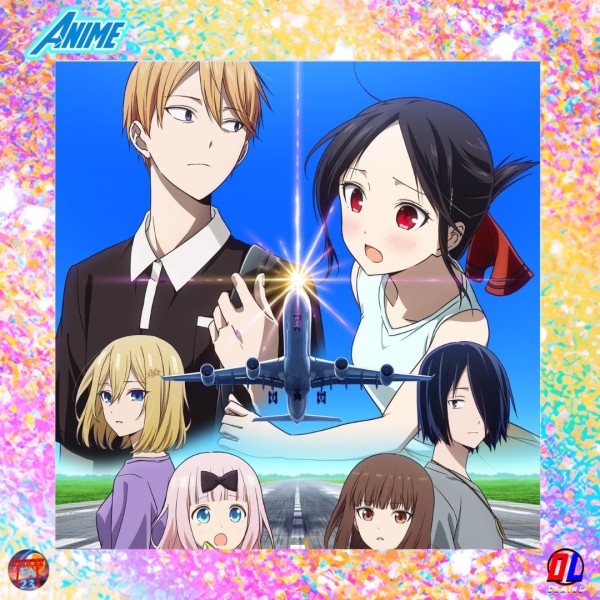 La première affiche promotionnelle met en scène les personnages principaux de la série, notamment Shinomiya Kaguya et Shirogane Miyuki, avec en arrière-plan une piste d’aéroport sur laquelle un avion est en train de décoller.