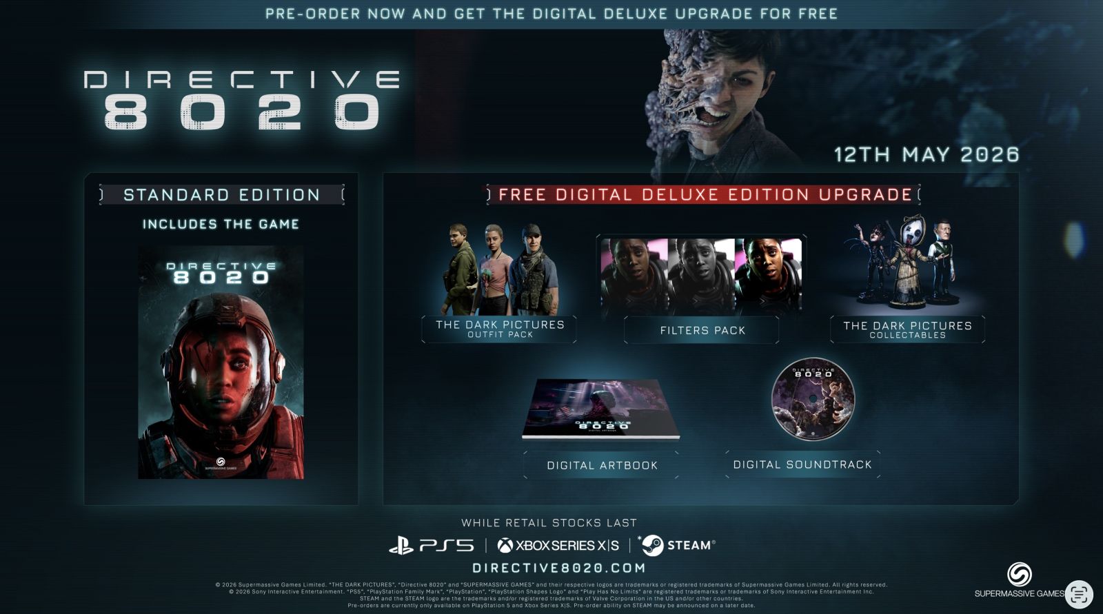 Supermassive Games a publié une nouvelle bande-annonce de 60 secondes pour Directive 8020, son jeu d’aventure et d’horreur futuriste qui sortira le 12 mai 2026. Diffusée à l’occasion du Galaxies Showcase, la bande-annonce offre une ultime présentation du cauchemar qui vous attend à l’intérieur du vaisseau-colonie Cassiopeia, où la mission pour sauver l’humanité tourne vite à une lutte pour la survie contre un organisme extraterrestre capable de prendre l’apparence de sa proie.