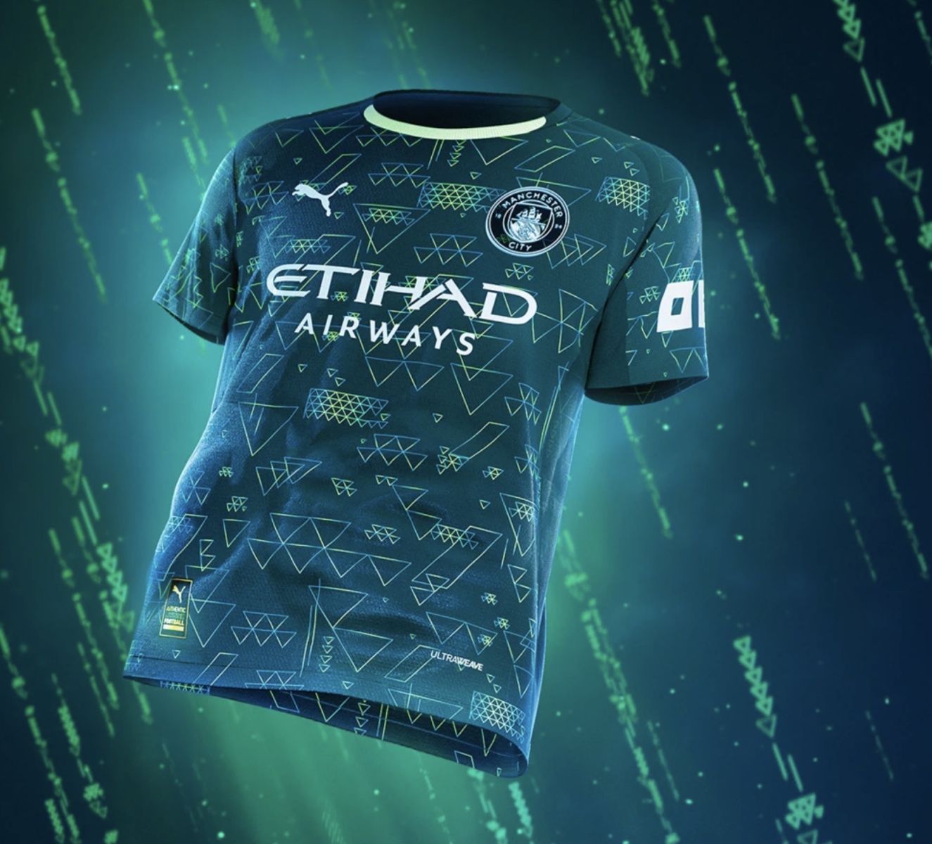 Cette édition spéciale du maillot de l’équipe première de Manchester City a été conçue pour faire le lien entre les univers numériques et physiques du football. Il intègre une puce NFC personnalisée, directement insérée dans l’emblématique blason du club.