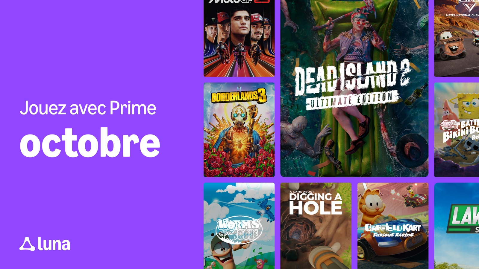 Les jeux suivants sont également disponibles gratuitement pour les utilisateurs d’Amazon Luna : Borderlands 3, LEGO® Star Wars™ III - The Clone Wars™, Dead Island 2 Ultimate Edition, MotoGP™25, Lawn Mowing Simulator: Landmark Edition, Farming Simulator 22, SpongeBob: Battle for Bikini Bottom - Rehydrated, Disney/Pixar Cars Mater-National Championship, A Game About Digging A Hole!, Garfield Kart - Furious Racing, Worms Crazy Golf, Wobbledogs et plus encore.